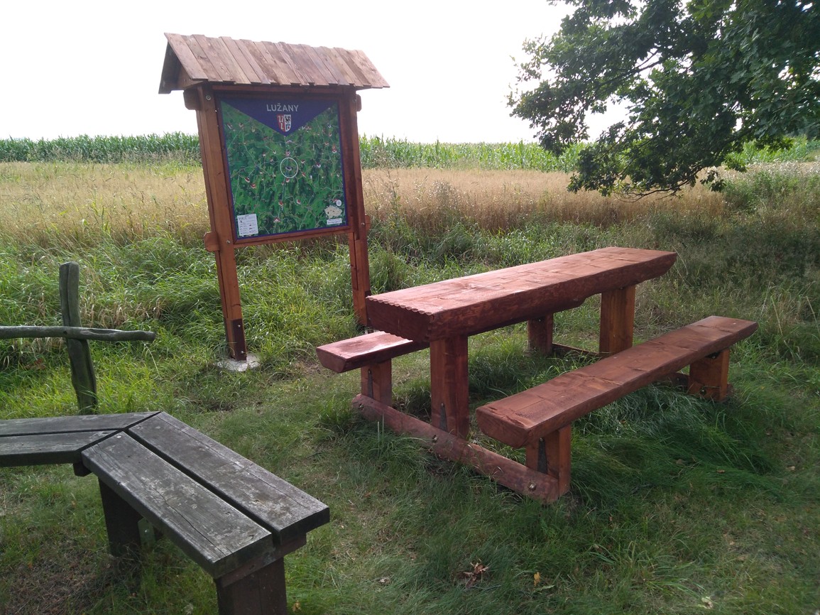 Na základě nabídky Mikroregionu Přešticko jsme si požádali o zařazení do projektu pořízení odpočinkového mobiliáře. Ten jsme naplánovali umístit jednak v Lužanech u nové výsadby dubů při bývalých dílnách u parku a jednak u křížku nad obcí Zelené na trase naší naučné stezky. Odpočinkový mobiliář vyrobila firma Zemědělská akciová společnost Koloveč. Velice pěkné sezení doplnila kreslená mapa našeho nejbližšího okolí.